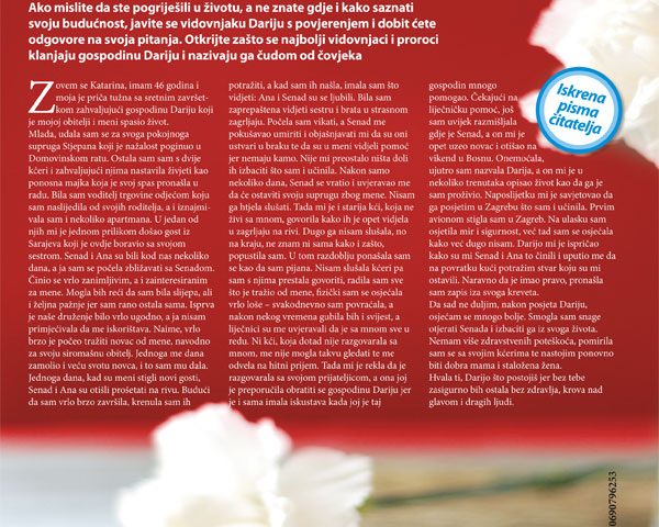Jednoga dana, kad su meni stigli novi gosti, Senad i Ana su otišli prošetati na rivu. Budući da sam vrlo brzo završila, krenula sam ih potražiti, a kad sam ih našla, imala sam što vidjeti: Ana i Senad su se ljubili. Bila sam zaprepaštena vidjeti sestru i brata u strasnom zagrljaju. Počela sam vikati, a Senad me pokušavao umiriti i objašnjavati mi da su oni ustvari u braku te da su u meni vidjeli pomoć jer nemaju kamo. Nije mi preostalo ništa doli ih izbaciti što sam i učinila. Nakon samo nekoliko dana, Senad se vratio i uvjeravao me da će ostaviti svoju suprugu zbog mene. Nisam ga htjela slušati. Tada mi je i starija kći, koja ne živi sa mnom, govorila kako ih je opet vidjela u zagrljaju na rivi. Dugo ga nisam slušala, no na kraju, ne znam ni sama kako i zašto, popustila sam. U tom razdoblju ponašala sam se kao da sam pijana. Nisam slušala kćeri pa sam s njima prestala govoriti, radila sam sve što je tražio od mene, fizički sam se osjećala vrlo loše – svakodnevno sam povraćala, a nakon nekog vremena gubila bih i svijest, a liječnici su me uvjeravali da je sa mnom sve u redu. Ni kći, koja dotad nije razgovarala sa mnom, me nije mogla takvu gledati te me odvela na hitni prijem. Tada mi je rekla da je razgovarala sa svojom prijateljicom, a ona joj je preporučila obratiti se gospodinu Dariju jer je i sama imala iskustava kada joj je taj gospodin mnogo pomogao. Čekajući na liječničku pomoć, još sam uvijek razmišljala gdje je Senad, a on mi je opet uzeo novac i otišao na vikend u Bosnu. Onemoćala, ujutro sam nazvala Darija, a on mi je u nekoliko trenutaka opisao život kao da ga je sam proživio. Naposlijetku mi je savjetovao da ga posjetim u Zagrebu što sam i učinila. Prvim avionom stigla sam u Zagreb. Na ulasku sam osjetila mir i sigurnost, već tad sam se osjećala kako već dugo nisam. Darijo mi je ispričao kako su mi Senad i Ana to činili i uputio me da na povratku kući potražim stvar koju su mi ostavili. Naravno da je imao pravo, pronašla sam zapis iza svoga kreveta.
