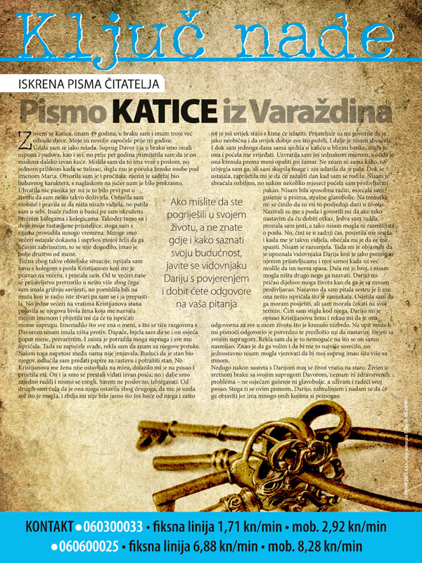 Nazivali su me s posla i govorili mi da ako tako nastavim da ću dobiti otkaz. Jedva sam radila, prestala sam jesti, a tako nisam mogla ni razmišljati o poslu. No, čini se u zadnji čas, posjetila me sestra i kada me je takvu vidjela, obećala mi je da će me spasiti. Nisam je razumjela. Tada mi je objasnila da je upoznala vidovnjaka Darija koji je jako pomogao njenim prijateljicama i njoj samoj kada su već mislile da im nema spasa. Dala mi je broj, i nisam mogla ništa drugo nego ga nazvati. Darijo mi pričao dijelove moga života kao da ga je sa mnom proživljavao. Naravno da sam pitala sestru je li mu ona nešto ispričala što je zanijekala. Osjetila sam da ga moram posjetiti, ali sam morala čekati na svoj termin. Čim sam stigla kod njega, Darijo mi je opisao Kristijanovu ženu i rekao mi da je ona odgovorna za sve u mom životu što je krenulo nizbrdo. Na upit može li mi pomoći odgovorio je potvrdno te predložio mi da nastavim živjeti sa svojim suprugom. Rekla sam da je to nemoguće na što se on samo nasmijao. Znao je da ga volim i da bi me to najviše usrećilo, no jednostavno nisam mogla vjerovati da bi moj suprug imao išta više sa mnom.